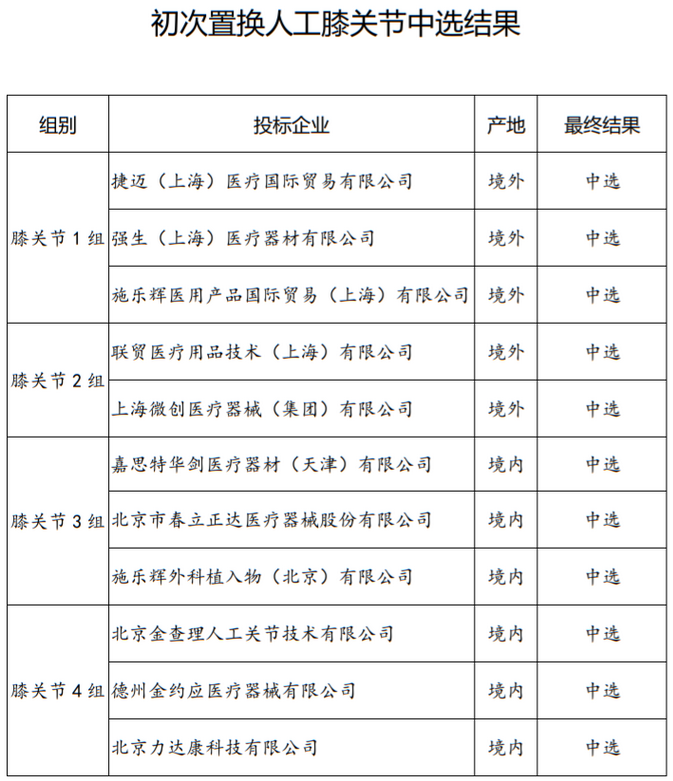 根據(jù)公告,初次置換人工膝關(guān)節(jié)中選企業(yè)包括強(qiáng)生、捷邁、施樂輝、上海微創(chuàng)等械企;