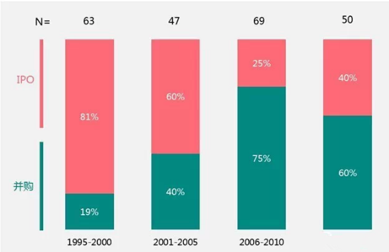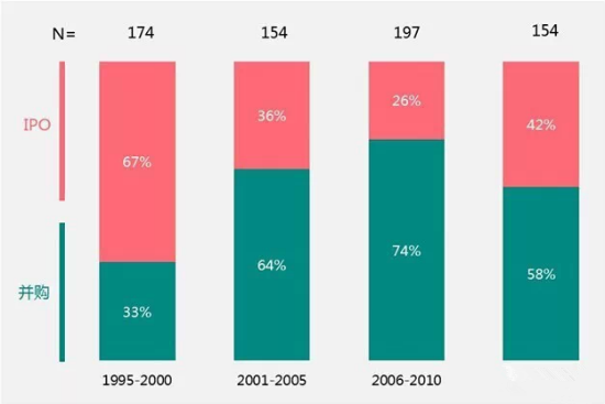 而2006-2010年段,在所有規(guī)模的風(fēng)投退出方式中,并購(gòu)方式超過75%,盡管2013年IPO方式改寫了這一數(shù)字,但仍然未能撼動(dòng)并購(gòu)方式的主導(dǎo)地位,最近的幾年間,在大于2.5億美元的公司或項(xiàng)目中超過60%以并購(gòu)方式退出,并購(gòu)企業(yè)的含金量已經(jīng)大幅度提升。