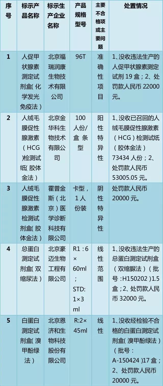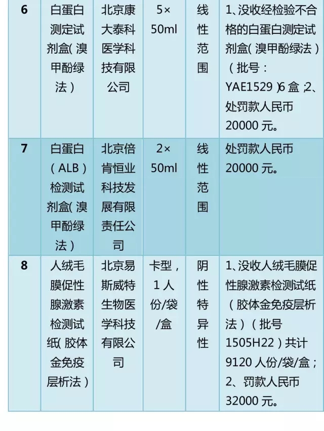 截至目前,北京食品藥品監督管理局已依據《醫療器械監督管理條例》的有關規定,對本公告中涉及的不合格產品全部開展核查處置,并作出沒收產品、行政罰款等行政處罰。其中,8個不符合標準規定的體外診斷試劑所涉及的8家企業共計被罰款20多萬人民幣。