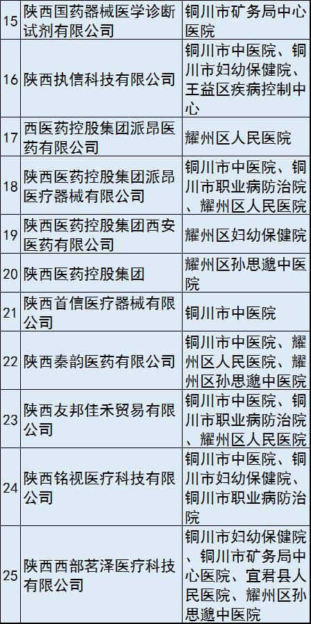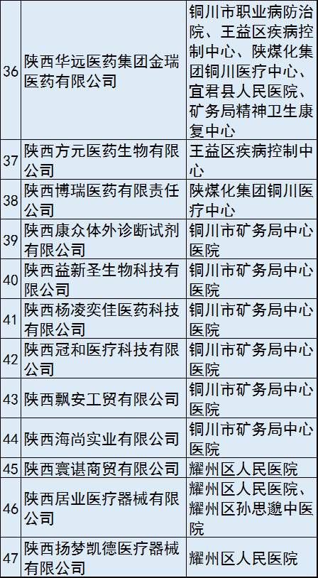 有4家醫院選定了10-15家(含10家)“兩票制”配送商,包括:耀州區孫思邈中醫院、銅川市礦務局中心醫院、銅川市職業病防治院、銅川市中醫醫院。