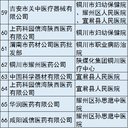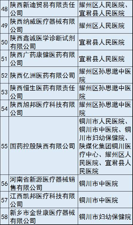 6月22日,陜西省銅川市衛計局發布了銅川市城市公立醫院藥品、耗材配送企業遴選結果公示,共有71家配送商拿到了該市耗材“兩票制”新政下的配送資格。