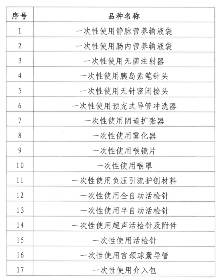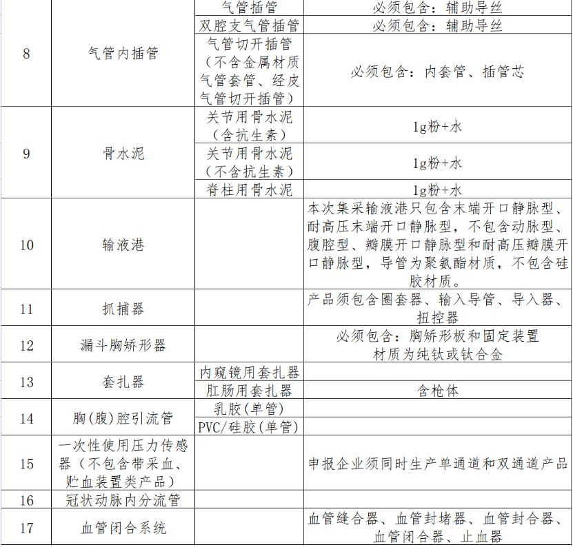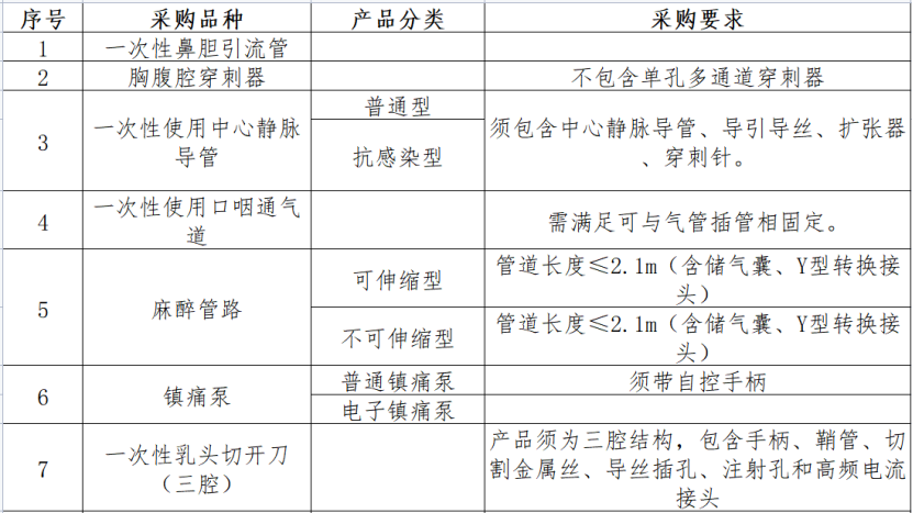 具體采購品類為:口咽通氣道、胸腹腔穿刺器、一次性使用靜脈導管、麻醉管路、鎮痛泵、一次性乳頭切開刀、氣管內插管、骨水泥、輸液港、抓捕器、漏斗胸、套扎器、胸(腹)腔引流管、一次性壓力傳感器、冠狀動脈內分流管、血管閉合系統、一次性鼻膽引流管。