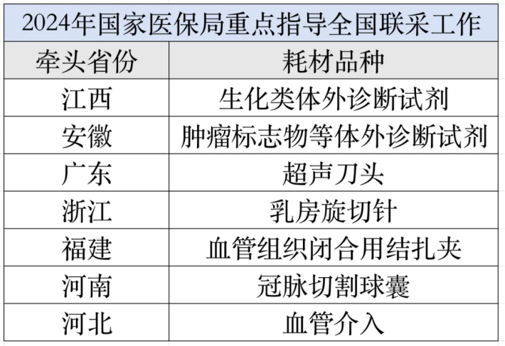 根據國家醫保局前述文件,國家醫保局將重點指導如下全國聯采工作:江西牽頭開展生化類體外診斷試劑聯盟采購;安徽牽頭開展腫瘤標志物等體外診斷試劑聯盟采購;廣東牽頭開展超聲刀頭聯盟采購;浙江牽頭開展乳房旋切針聯盟采購;福建牽頭開展血管組織閉合用結扎夾聯盟采購;河南牽頭開展冠脈切割球囊等聯盟采購;河北牽頭開展血管介入等耗材聯盟采購。