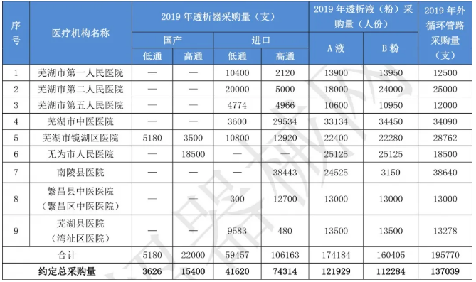 根據(jù)《意見(jiàn)稿》,蕪湖市所有公立醫(yī)療機(jī)構(gòu)將對(duì)血透類醫(yī)用耗材中透析器、透析液(粉)、體外循環(huán)血路三個(gè)品種進(jìn)行帶量采購(gòu),采購(gòu)量不低于全市公立醫(yī)療機(jī)構(gòu)上年度同期該產(chǎn)品采購(gòu)量的70%(2019年度具體采購(gòu)量如下),總計(jì)506211支,采購(gòu)周期為2年。