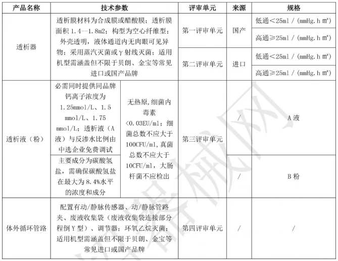 《意見(jiàn)稿》顯示三個(gè)采購(gòu)品種共分為4個(gè)評(píng)審單元,都明確了技術(shù)參數(shù)需求,其中透析器依據(jù)醫(yī)療器械注冊(cè)證分為國(guó)產(chǎn)和進(jìn)口兩個(gè)層次,同一層次、同一產(chǎn)品目錄的產(chǎn)品為一個(gè)評(píng)審單元,同一評(píng)審單元視為同一質(zhì)量層次,各評(píng)審單元遴選2家生產(chǎn)企業(yè)。