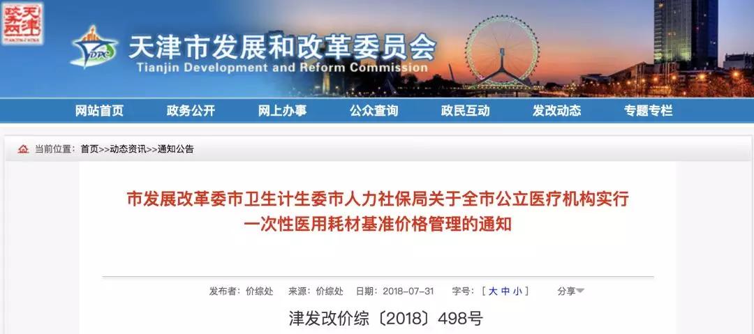 7月31日,天津市發(fā)展和改革委員會(huì)官網(wǎng)發(fā)布《市發(fā)展改革委市衛(wèi)生計(jì)生委市人力社保局關(guān)于全市公立醫(yī)療機(jī)構(gòu)實(shí)行一次性醫(yī)用耗材基準(zhǔn)價(jià)格管理的通知》(津發(fā)改價(jià)綜〔2018〕498號(hào))(以下稱(chēng)《通知》),對(duì)天津市所有公立醫(yī)院臨床使用的全部一次性醫(yī)用耗材實(shí)行新的價(jià)格管理機(jī)制,自8月1日起正式實(shí)施。