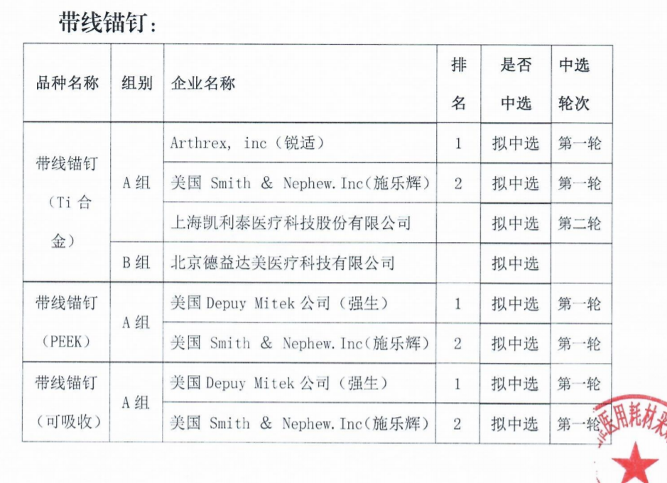 帶線錨釘擬中選企業(yè)包括強生、施樂輝、銳適等;