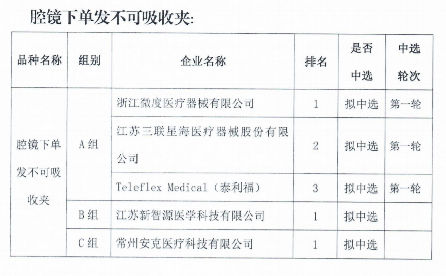 腔鏡下單發(fā)不可吸收夾擬中選企業(yè)包括浙江微度、江蘇三聯星海、泰利福等。