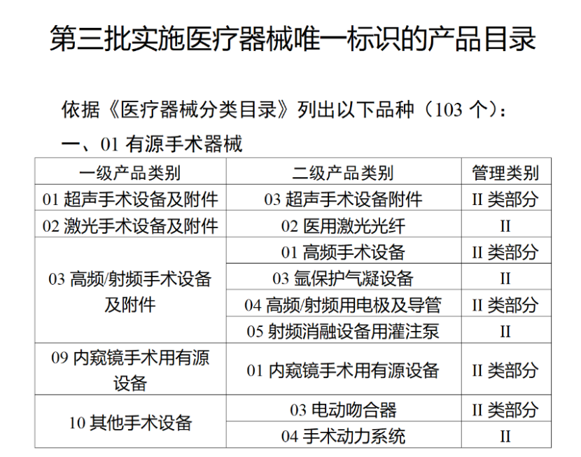 第三批醫(yī)療器械唯一標(biāo)識(shí)實(shí)施品種共包括103種二類醫(yī)療器械,有超聲手術(shù)設(shè)備、激光手術(shù)設(shè)備及附件、高頻/射頻手術(shù)設(shè)備及附件、內(nèi)窺鏡手術(shù)用有源設(shè)備、神經(jīng)和心血管手術(shù)器械-心血管介入器械、骨科手術(shù)器械、診斷X射線機(jī)、光治療設(shè)備、起搏系統(tǒng)分析設(shè)備、注射泵、臨床檢驗(yàn)器械等。