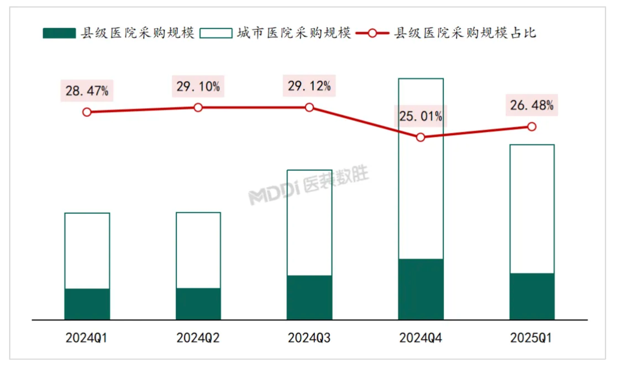 (2024-2025年3月國內公立醫院醫療設備采購規模及縣級醫院占比季度變化)