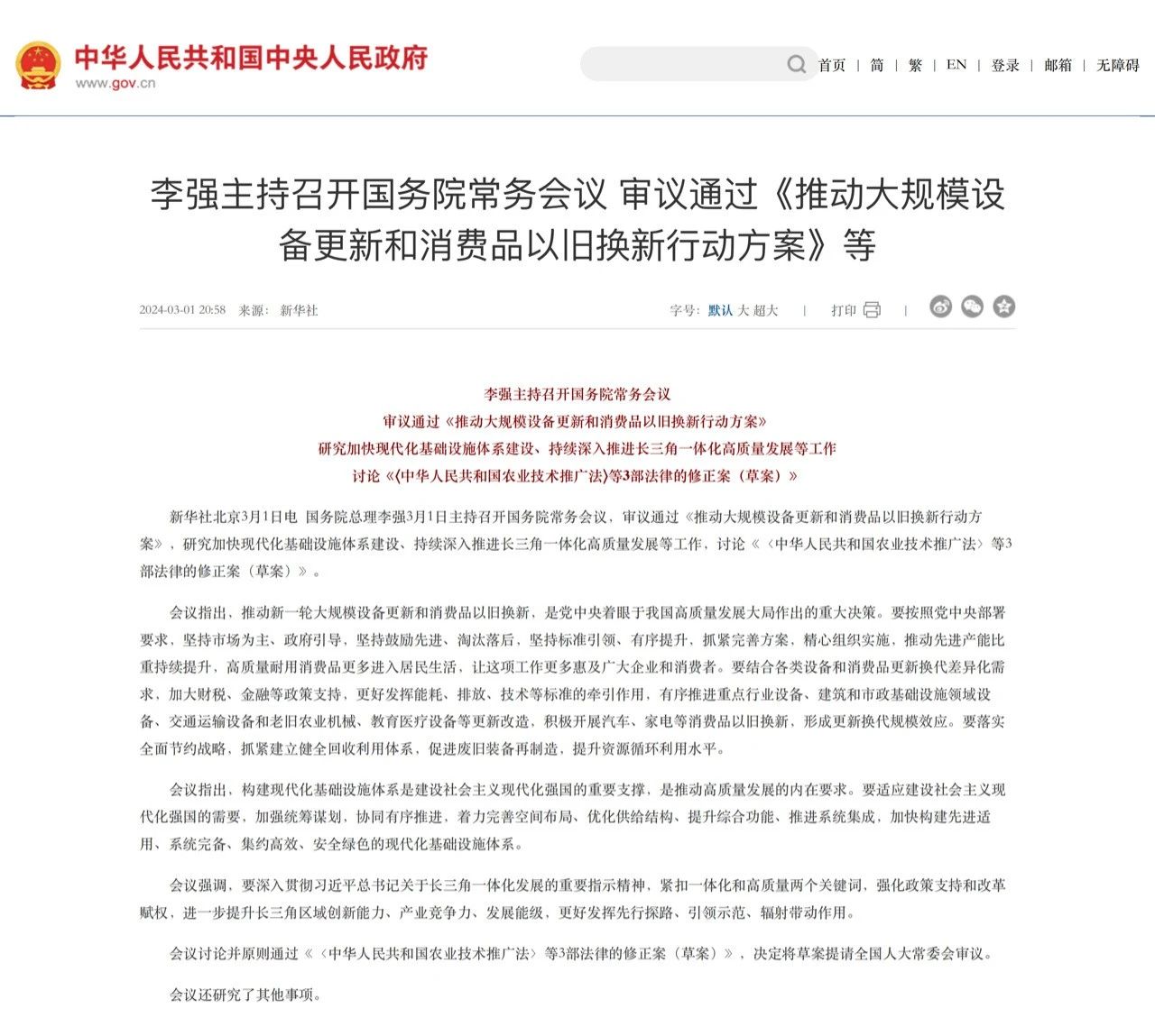 新華社報(bào)道,國(guó)務(wù)院總理李強(qiáng)3月1日主持召開國(guó)務(wù)院常務(wù)會(huì)議,審議通過《推動(dòng)大規(guī)模設(shè)備更新和消費(fèi)品以舊換新行動(dòng)方案》,研究加快現(xiàn)代化基礎(chǔ)設(shè)施體系建設(shè)、持續(xù)深入推進(jìn)長(zhǎng)三角一體化高質(zhì)量發(fā)展等工作,討論《〈中華人民共和國(guó)農(nóng)業(yè)技術(shù)推廣法〉等3部法律的修正案(草案)》。