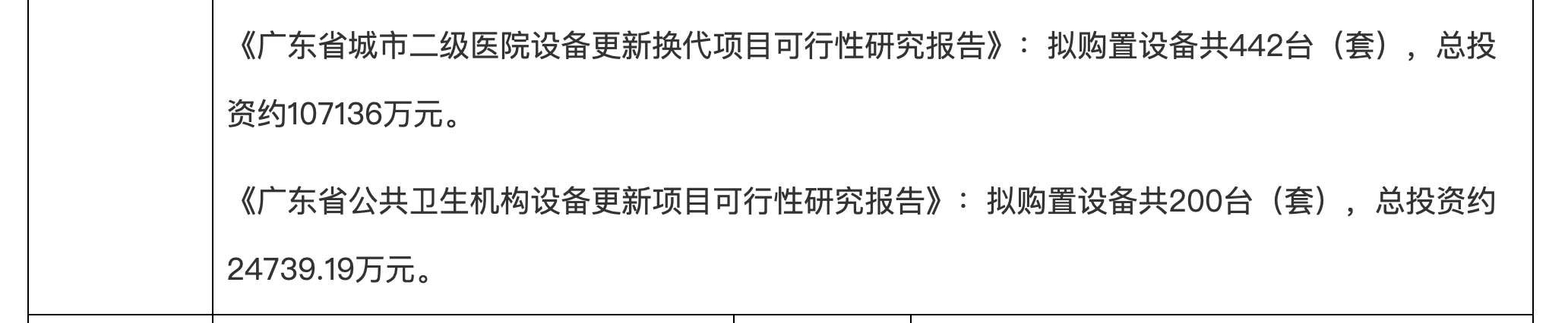 《廣東省城市二級醫院設備更新換代項目可行性研究報告》:擬購置設備共442臺(套),總投資約107136萬元。