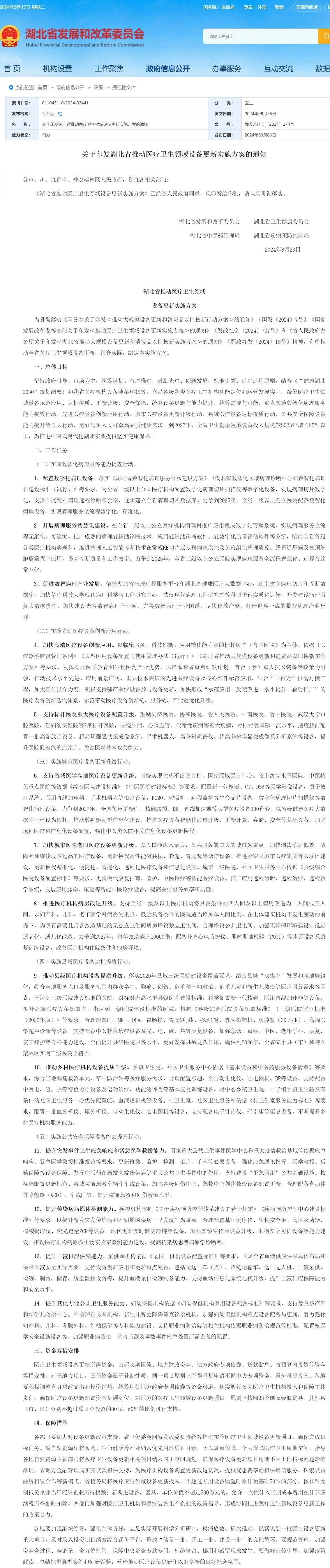 近日,湖北省發改委印發《湖北省推動醫療衛生領域設備更新實施方案》(完整見文末)。
