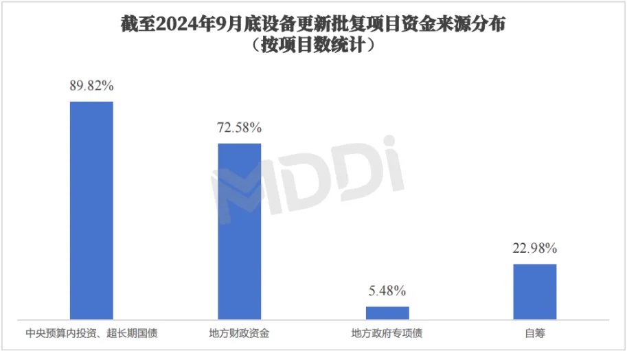 醫療設備普遍價格昂貴,財政支持力度與市場采購活力緊密掛鉤。據醫裝數勝整理,截至9月底,設備更新批復項目的資金來源以“中央預算內投資或超長期國債”+“地方財政資金”的方式居多,國家及地方的財政支持力度較大,需要自籌部分資金的項目僅占22.98%。
