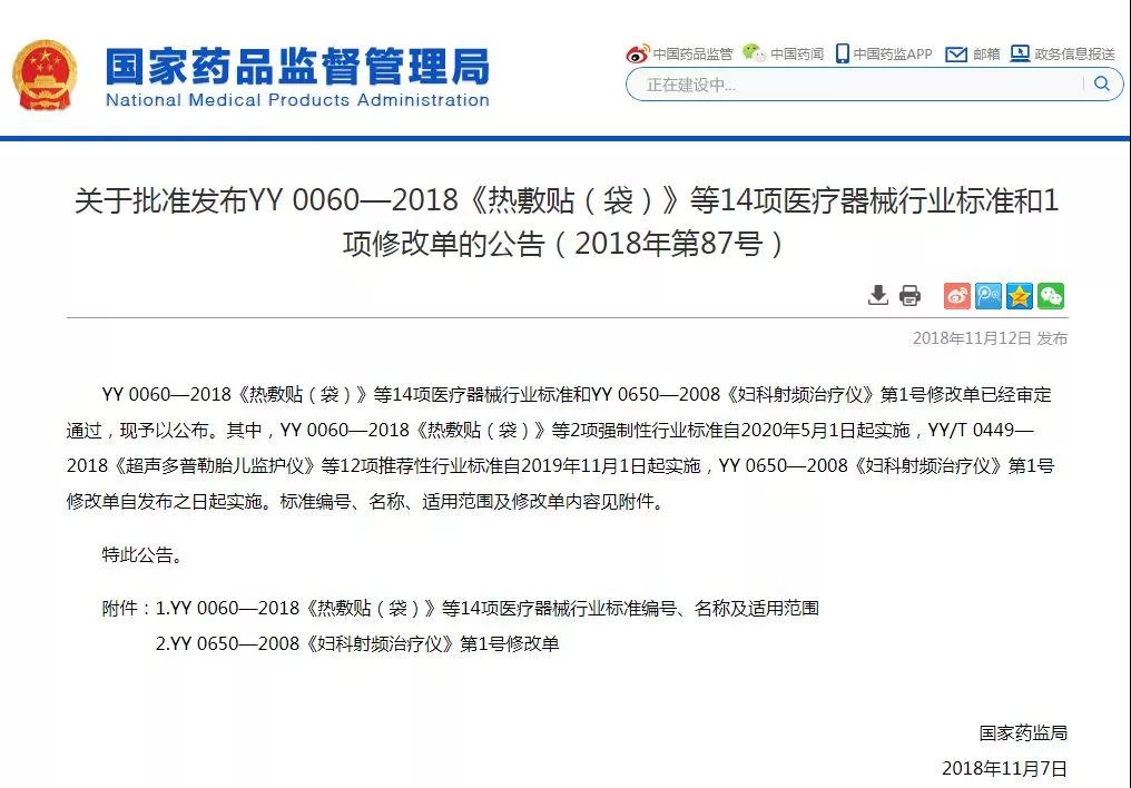 1、 YY 0060-2018 《熱敷貼(袋)》