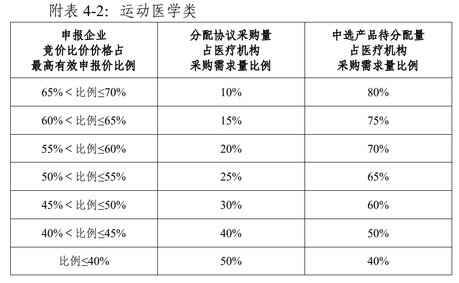 對于有效申報企業數為1家和2家的競價單元,將根據申報企業競價比價價格占最高有效申報價的比例,梯度分配醫療機構協議采購量。需要注意的是,在這一競價單元中,所有剩余量由醫療機構分配給中選排名首位的中選企業。