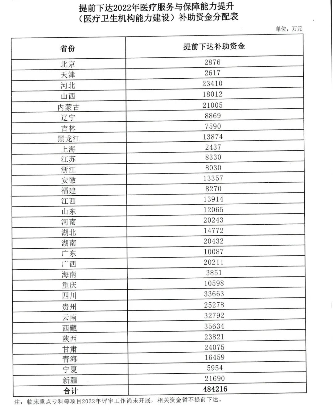 同一天,財政部、國家衛生健康委發布《關于提前下達2022年醫療服務與保障能力提升(醫療衛生機構能力建設)補助資金預算的通知》。