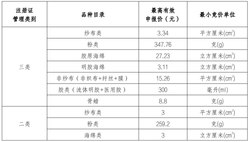 3.擬中選資格。企業申報價格不高于同注冊證管理類別同品種目錄內企業最低申報價格1.3倍的,獲得擬中選資格。二類注冊證紗布類、粉類、海綿類企業擬中選價格≤對應的三類注冊證紗布類、粉類、明膠海綿類企業最高擬中選價格的。