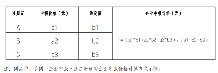 1.申報價格。同注冊證管理類別同品種目錄內,同一企業只有一張注冊證的,該注冊證申報價格作為企業申報價格。同注冊證管理類別同品種目錄內,同一企業有多張注冊證的,每張注冊證確定一個申報價格,每張注冊證的申報價格≤同品種目錄本企業其他注冊證申報價格的1.3倍,將各注冊證對應的約定采購量作為權重,通過加權平均方法計算出企業申報價格。