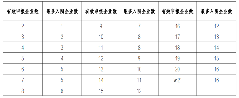 2.入圍企業。同注冊證管理類別同品種目錄內,依據企業申報價格按照由低到高的順序確定排名,申報價格最低的為第一名,次低的為第二名,以此類推。最多入圍企業數量見下表。企業申報價格相同的,醫療機構申報約定采購量大的排名靠前。