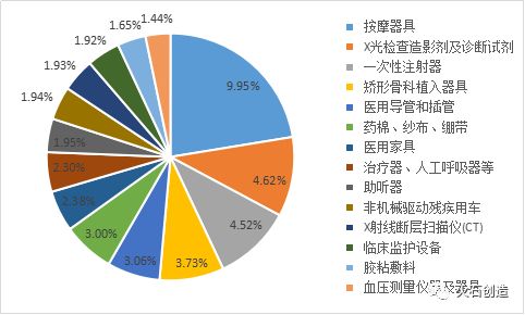 從我國醫療器械出口產品結構來看,目前我國醫療器械出口產品仍以低值耗材為主,雖然在高端醫療器械領域,國產超聲、監護等影像設備以及人工關節等高值耗材在國際市場的影響力也逐漸顯現,但出口規模仍然偏小。2017年,以按摩保健器具、醫用耗材敷料為主的前十四大出口產品,占據我醫療器械出口總額的44%。電子診斷患者監測系統、超聲波掃描電子診斷儀器、磁共振設備(MRI) 、B型超聲波診斷儀等被增稅產品對美出口額在我國對美醫療器械出口總額中占比不足10%。