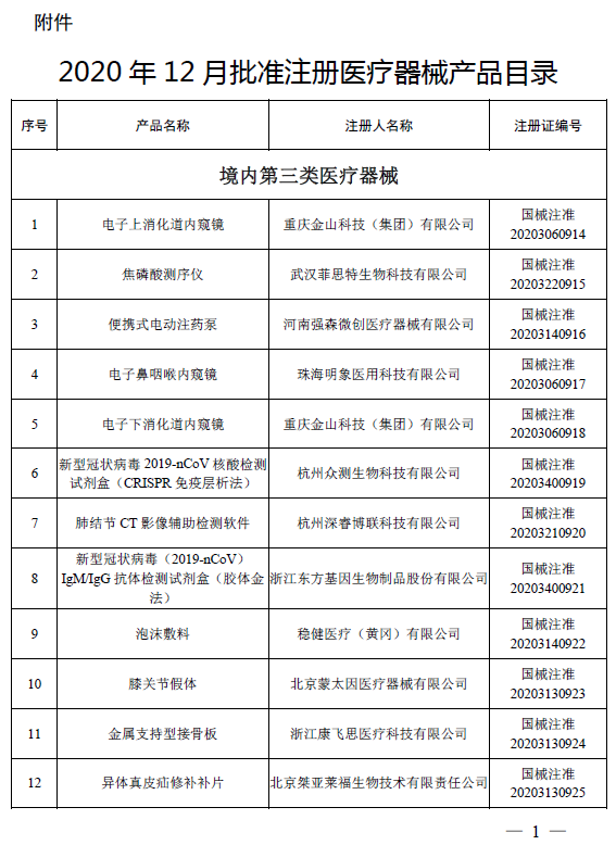 附件:2020年12月批準(zhǔn)注冊醫(yī)療器械產(chǎn)品目錄
