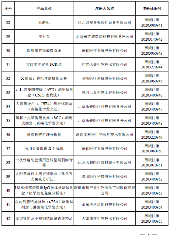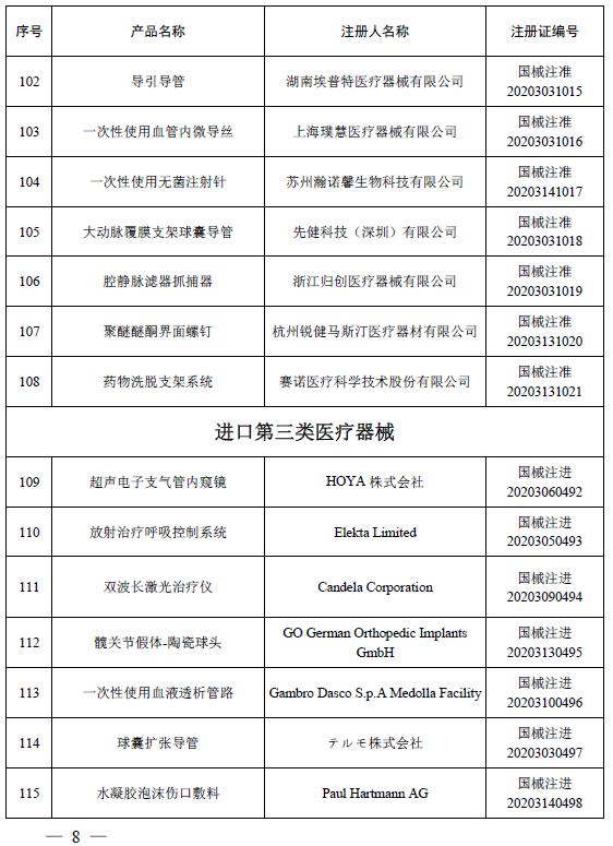醫(yī)藥網(wǎng)1月20日訊 2020年12月,國家藥品監(jiān)督管理局共批準(zhǔn)注冊醫(yī)療器械產(chǎn)品155個(gè)。其中,境內(nèi)第三類醫(yī)療器械產(chǎn)品108個(gè),進(jìn)口第三類醫(yī)療器械產(chǎn)品24個(gè),進(jìn)口第二類醫(yī)療器械產(chǎn)品20個(gè),港澳臺醫(yī)療器械產(chǎn)品3個(gè)(具體產(chǎn)品見附件)。
