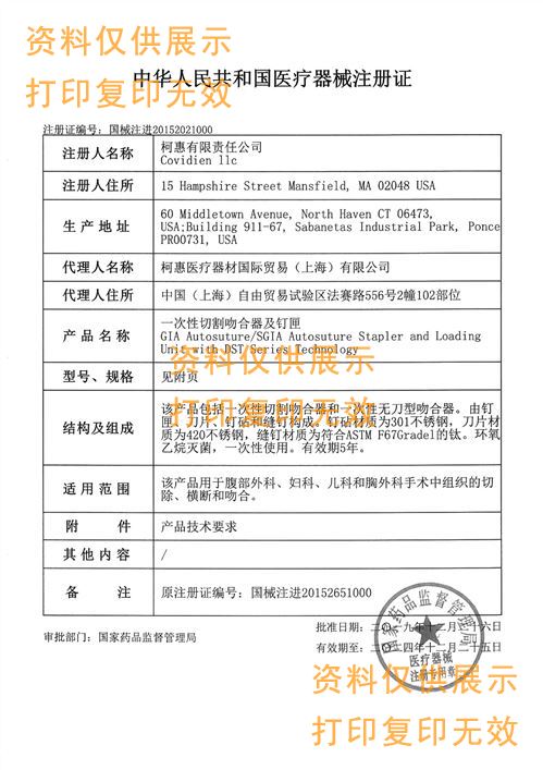 該產品包括一次性切割吻合器和一次性無刀型吻合器。由釘匣、刀片、釘砧和縫釘構成。釘砧材質為301不銹鋼,刀片材質為420不銹鋼,縫釘材質為符合ASTM F67Grade1的鈦。環氧乙烷滅菌,一次性使用。有效期5年。