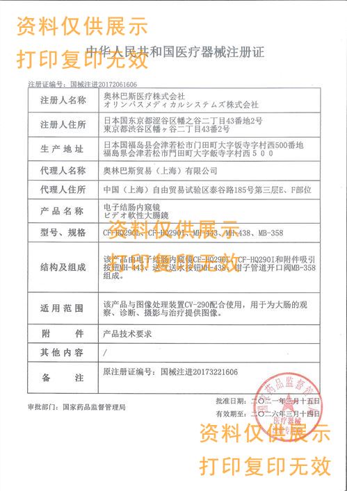該產(chǎn)品由電子結(jié)腸鏡(CF-H190L和CF-H190I)和附件組成,附件包含吸引按鈕(MH-443)、送氣送水按鈕(MH-438)、鉗子管道開口閥(MB-358)。性能參數(shù):分辨率≥3.51Lp/mm。照度:在工作距離處,照度應(yīng)不小于8000lx。視場角:170°±15%景深:2mm~100mm。送水量:送水量不得小于45ml/min。吸引量:吸引量不小于400ml/min。送氣量:送氣量≥800ml/min。彎曲角:彎曲角:上:180°;下:180°;右:160°;左:160°(允差:±10%)。